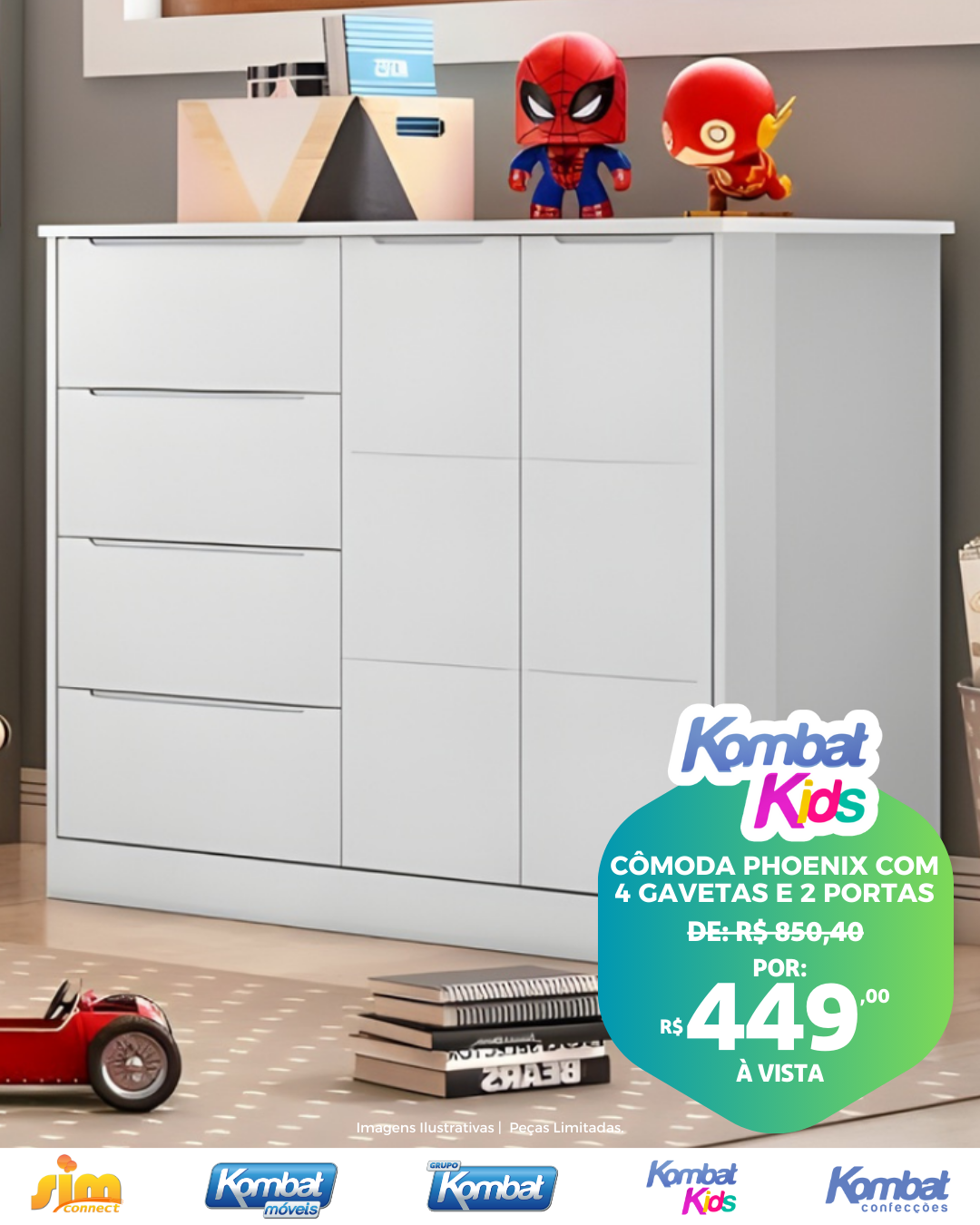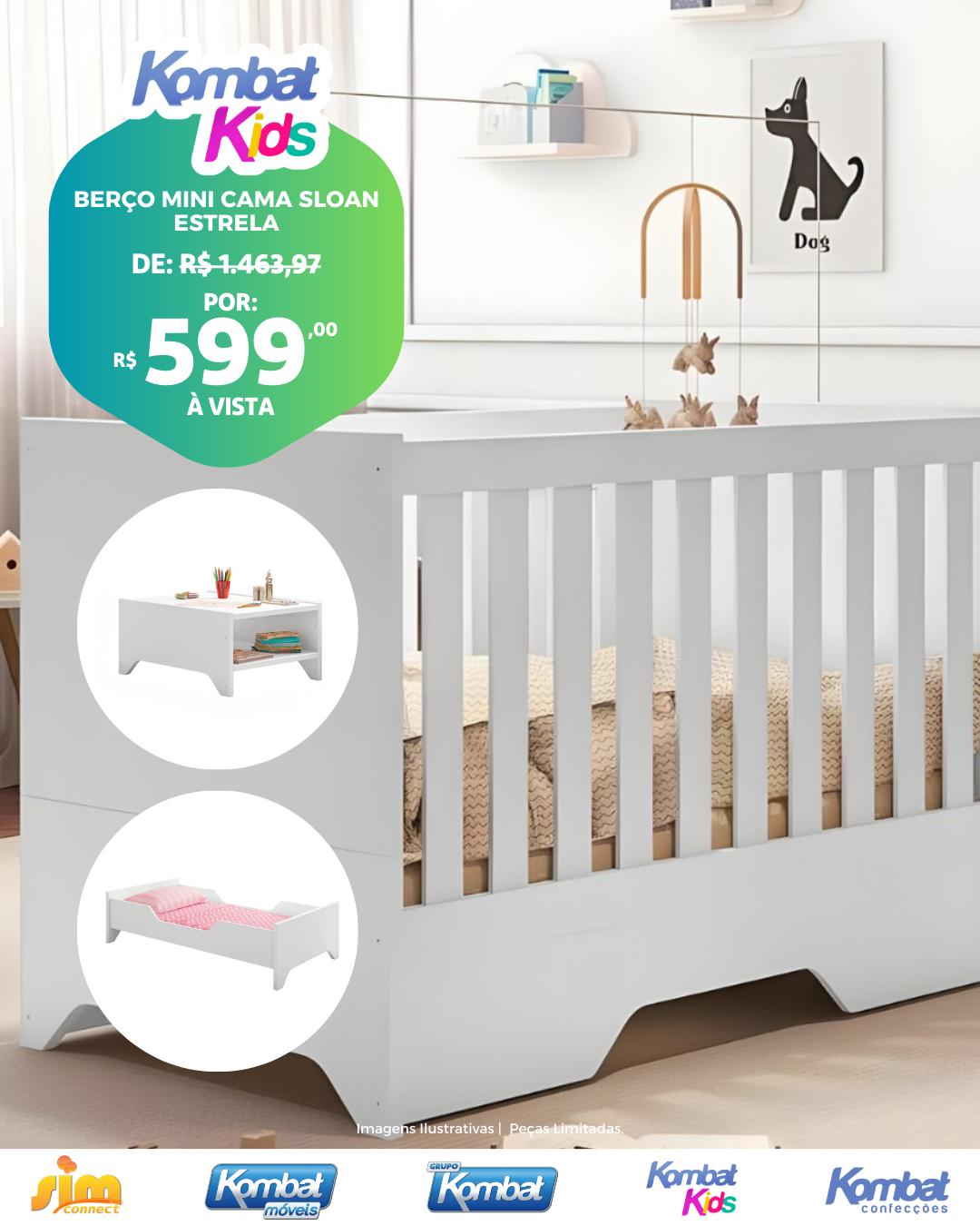Na Kombat Kids, você encontra roupas, móveis e tudo para o quarto do seu bebê. Atendimento especializado, parcelamento em até 18x no cartão ou no crediário próprio, com entrega em Paraguaçu e região.